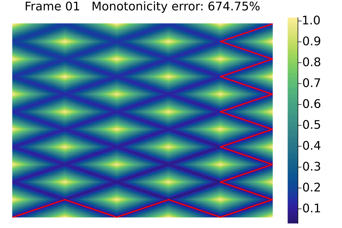 By introducing vertices in the middle of parts of the curves that are being traversed in the wrong direction, one can refine the solution, till effectively reaching the optimal monotone solution. This process is demonstrated below. As one can see, the error is negligible after a few (say four) iterations. After that, it becomes a bit pointless.